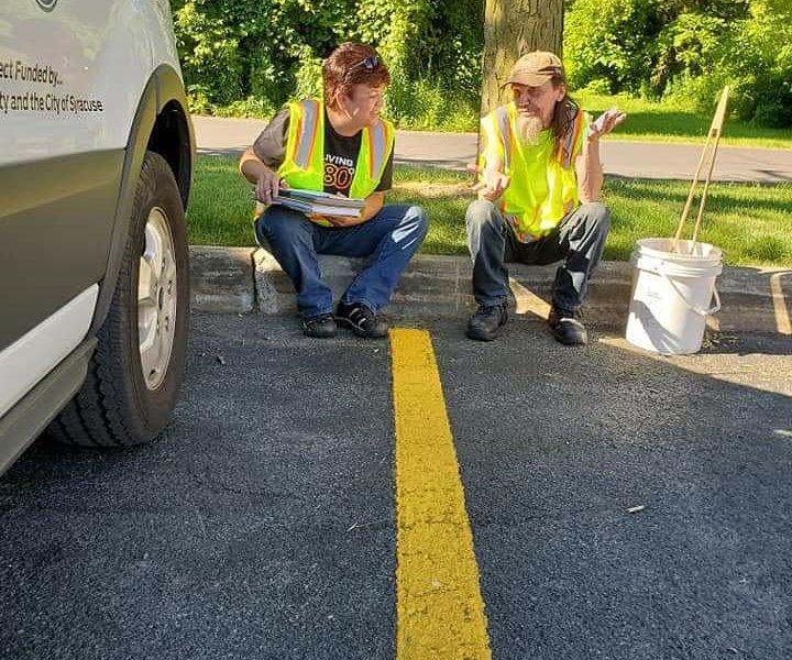 Every Monday, Wednesday, and Friday, the Hire Ground van picks up nine individuals at various locations throughout the City of Syracuse and Onondaga County. Once they complete the intake process the Hire Ground team transports our friends to job sites to work on beautification and other various projects. These projects include but are not limited to, picking up litter after a concert at the St. Joseph’s Health Amphitheater, building picnic tables for the NY State Fair, and picking up trash from area parks and roadways.