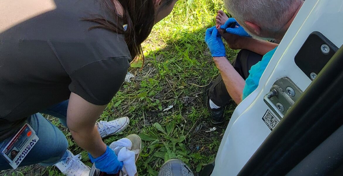 Collaboration is a big part of what needs to happen to assists our friends outdoors. We received a call from Rescue Mission for assistance with a gentleman they were assisting who needed medical attention. Doctor Lehmann was ready to assist and the connection was made to help this man. The info we received was that he had a leg abscess that had maggots invading the wound. When we arrived Doc looked at the leg cleaned it up and bandaged it, when he was done our new friend said that his foot was worse than his leg. When Doc pulled off the sock we were met by dozens of maggots crawling around a little pinky toe wound. Doc was able to clean out the area disinfect and assess the wound. Our friend had a bone from his pinky exposed and didn’t even realize it. Doc later explained to us that because of our friends severe addiction to alcohol that he now suffers from alcohol neuropathy. What is Alcohol Neuropathy? Alcoholic neuropathy involves coasting caused by damage to nerves that results from long term excessive drinking of alcohol and is characterized by spontaneous burning pain, hyperalgesia and allodynia. Once area was clean and bandaged we were able to provide new socks, sneakers and antibiotics. Doc will be visiting him next week to discuss follow up care with our friend regarding this serious condition. We at IMFK will work with any organization that is willing to assist any of our friends outdoors. Relationship building is important with our friends outdoors but relationship building with organizations is vital as well so we can assist our friends with a higher level of care.
