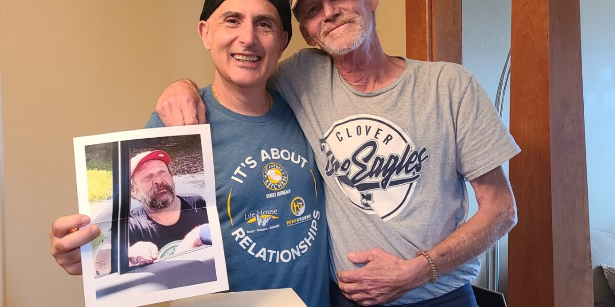 We understand that living on the streets is life and death in CNY. Since 2011 44 friends have passed away living outdoors. 2 women were murdered, 2 friends died in abandoned house fire trying to stay warm, 30 friends have overdosed, 8 friends have died from health complication from living a hard life outdoors and 2 friends were hit by vehicles while walking on the side of the road. Scott who is in the picture we are holding up is one of the men hit by a vehicle. We met Scott in early 2015 living outdoors, he was one of Steve’s (pictured here) good friends. Steve and Scott were homeless living on the streets of Syracuse. Steve made it indoors on 7/7/15 with Scott making indoors not to far after in late fall of that year. Steve addressed his addiction was reunited with his family and is now living in S. Carolina with his family. Scott never addressed his addiction and was disconnected from his family who is living in N. Carolina. In March 2018 Scott was walking home in a drunken state and fell into the road into on coming traffic. Scott was severely injured and passed away due to his injuries. IMFK did a service for Scott here in Syracuse and we have been the guardians of his remains knowing there would be a time to transport him back to the Carolinas to spread his ashes. Well the opportunity presented itself last week as Steve was able to come up to Syracuse for a visit and to take care of some business. Steve met us at IMFK for a reunion with his friend Scott. Steve and I shared funny memories of Scott and talked about life coming to a full circle. Steve will be transporting Scott back home and spreading his ashes in the State he was born in. Our mission at IMFK is to bring Value and Dignity to our friends even unto DEATH! Scott Love you my brother YOU WERE NOT INVISIBLE!