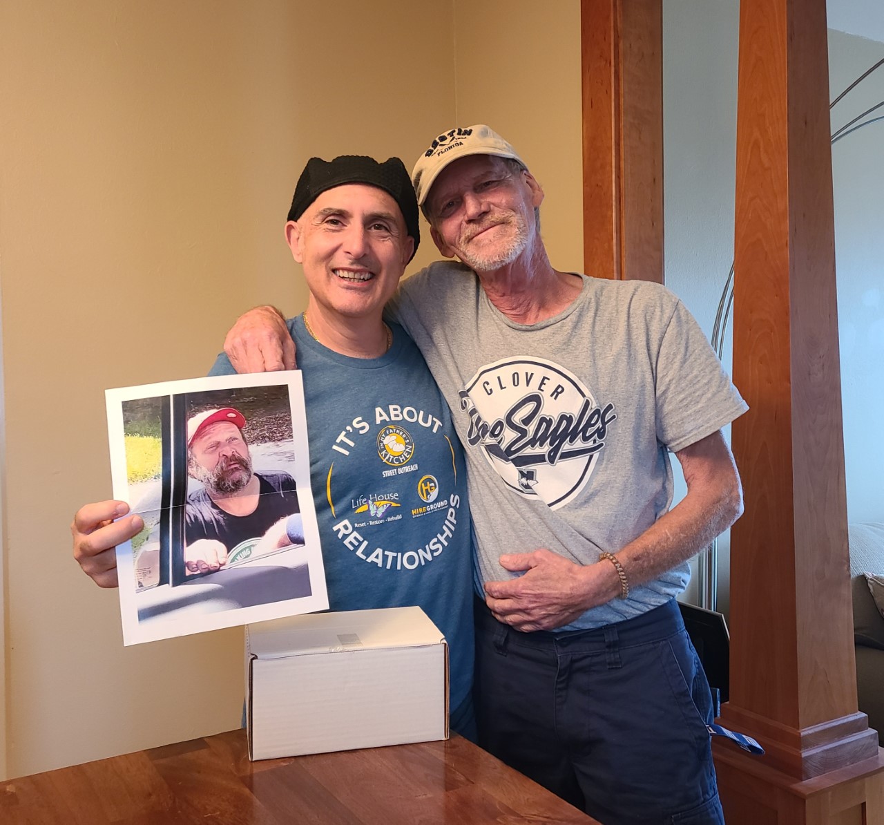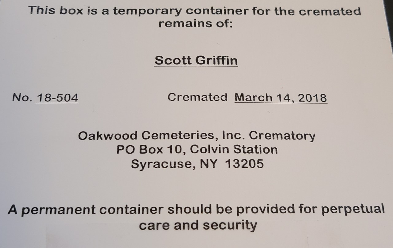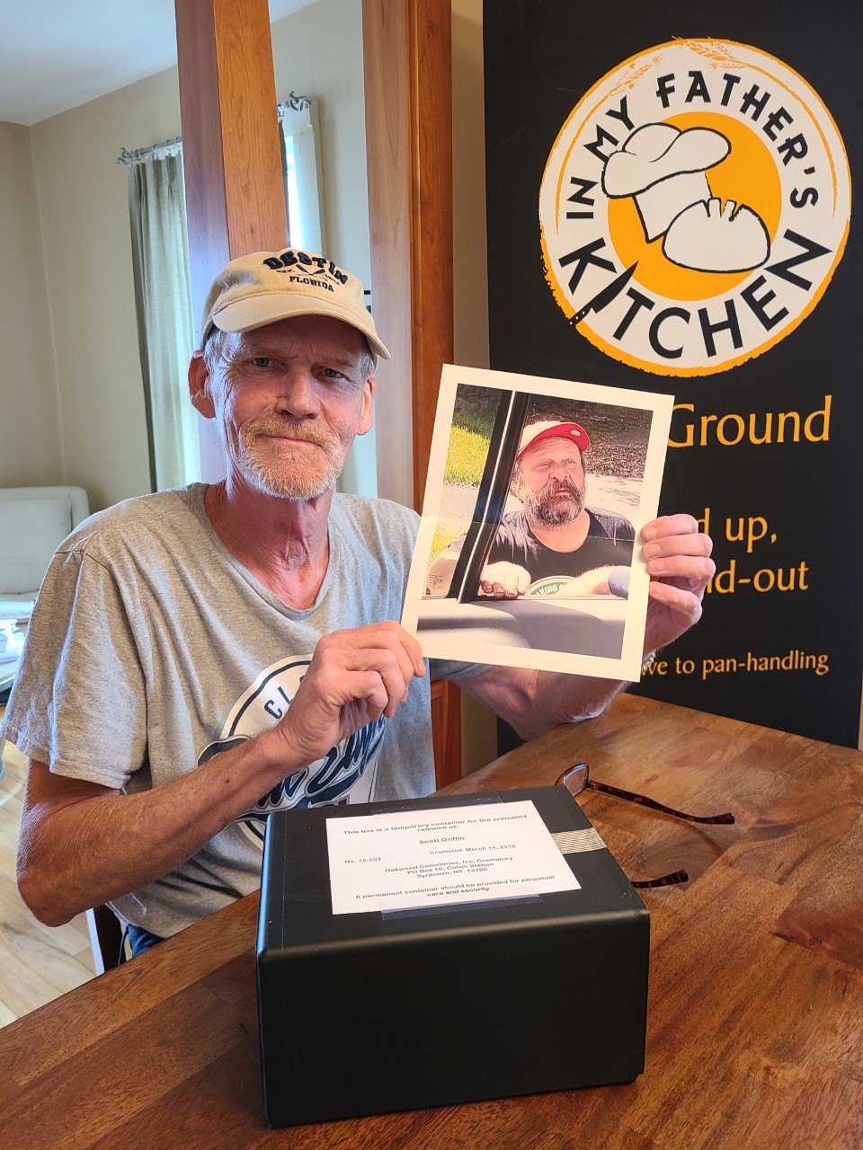 We understand that living on the streets is life and death in CNY. Since 2011 44 friends have passed away living outdoors. 2 women were murdered, 2 friends died in abandoned house fire trying to stay warm, 30 friends have overdosed, 8 friends have died from health complication from living a hard life outdoors and 2 friends were hit by vehicles while walking on the side of the road. Scott who is in the picture we are holding up is one of the men hit by a vehicle. We met Scott in early 2015 living outdoors, he was one of Steve’s (pictured here) good friends. Steve and Scott were homeless living on the streets of Syracuse. Steve made it indoors on 7/7/15  with Scott making it indoors not to far after in late fall of that year. Steve addressed his addiction was reunited with his family and is now living in S. Carolina with his family. Scott never addressed his addiction and was disconnected from his family who is living in N. Carolina. In March 2018 Scott was walking home in a drunken state and fell into the road into on coming traffic. Scott was severely injured and passed away due to his injuries. IMFK did a service for Scott here in Syracuse and we have been the guardians of his remains knowing there would be a time to transport him back to the Carolinas to spread his ashes. Well the opportunity presented itself last week as Steve was able to come up to Syracuse for a visit and to take care of some business. Steve met us at IMFK for a reunion with his friend Scott. Steve and I shared funny memories of Scott and talked about life coming to a full circle. Steve will be transporting Scott back home and spreading his ashes in the State he was born in. Our mission at IMFK is to bring Value and Dignity to our friends even unto DEATH! Scott Love you my brother YOU WERE NOT INVISIBLE!